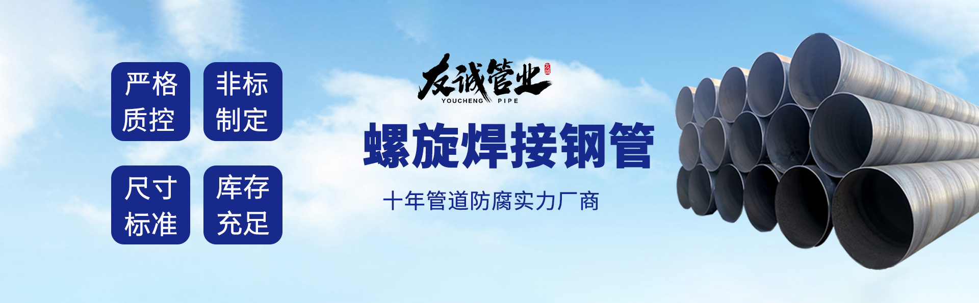 滄州友誠(chéng)管業(yè)有限公司是一家專(zhuān)業(yè)從事生產(chǎn)防腐涂塑管道及管件于一體的大型企業(yè)。公司注冊(cè)資金8600萬(wàn)元,位于中國(guó)管道生產(chǎn)基地—河北鹽山縣,近靠京滬高速、榮烏高速、黃石高速30公里,高鐵滄州西站40公里,天津國(guó)際機(jī)場(chǎng)、濟(jì)南遙墻機(jī)場(chǎng)150公里,為客戶來(lái)訪及業(yè)務(wù)發(fā)展提供了便利的交通條件。 鋼管系列:螺旋鋼管、無(wú)縫鋼管、ERW直縫焊管、JCOE埋弧焊直縫鋼管、熱鍍鋅鋼管。 涂塑系列:內(nèi)外涂塑鋼管、涂塑復(fù)合鋼…… 了解更多